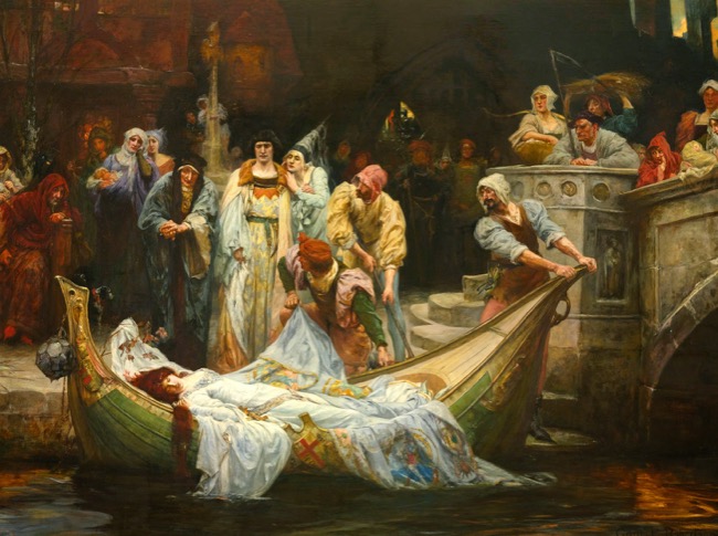 A version of the story appeared in the early 13th century “Mort Artu” in which the Demoiselle d’Escalot dies of unrequited love for Lancelot and drifts down a river to Camelot in a boat.