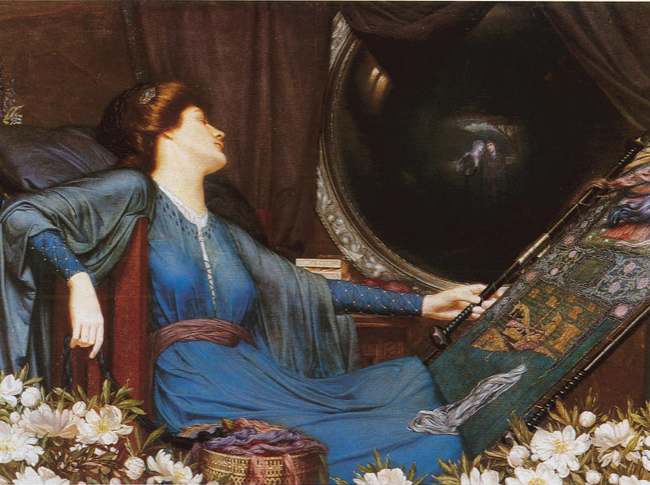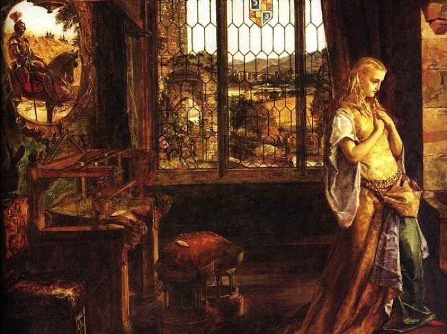 Elaine of Astolat, the Fair Maiden, Lady of Shalott, figures briefly in Arthurian legend. She becomes a symbol of steadfast but unrequited love. She, in fact, falls in love with Sir Lancelot who, however, has eyes only for his Queen Guinivere.